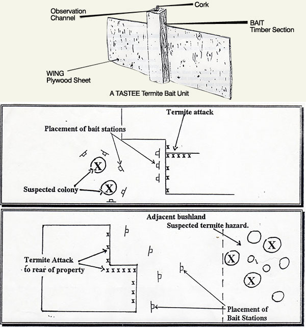 TASTEE Termite Baits in no way serve as a protection against termite attack to buildings or property. The wood used in the manufacture of these baits does not contain chemicals. The baits are an aid to the detection and treatment of termite activity. If used correctly and dusted by a competent pest control operator, the successful elimination of the attacking termite colony is possible. However, guarantees with respect to the success of the arsenic dust treatments are the responsibility of the attending pest control operator.